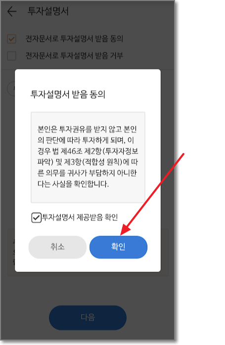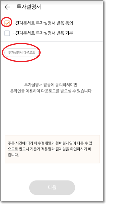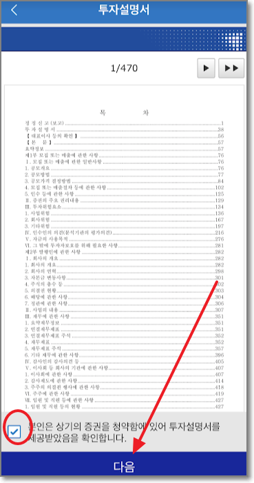 투자설명서 전자교부에 "교부함"에 체크하고 투자설명서가 나오면 "본인은 상기의 증권을 청약함에 있어 투자설명서를 제공받았음을 확인합니다"를 체크하고 "다음"을 누릅니다.