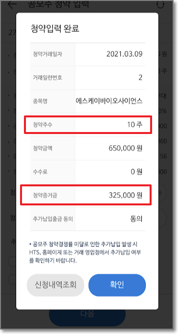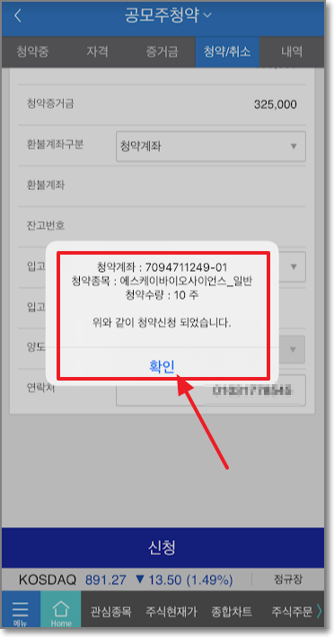 이렇게 하면 삼성증권 앱에서도 sk바이오사이언스 공모주청약이 완료되었습니다. 밑에 숫자는 금액이 아닌 번호이니 당황하지 마시고 그대로 삼상증권 앱을 끄시면 됩니다.