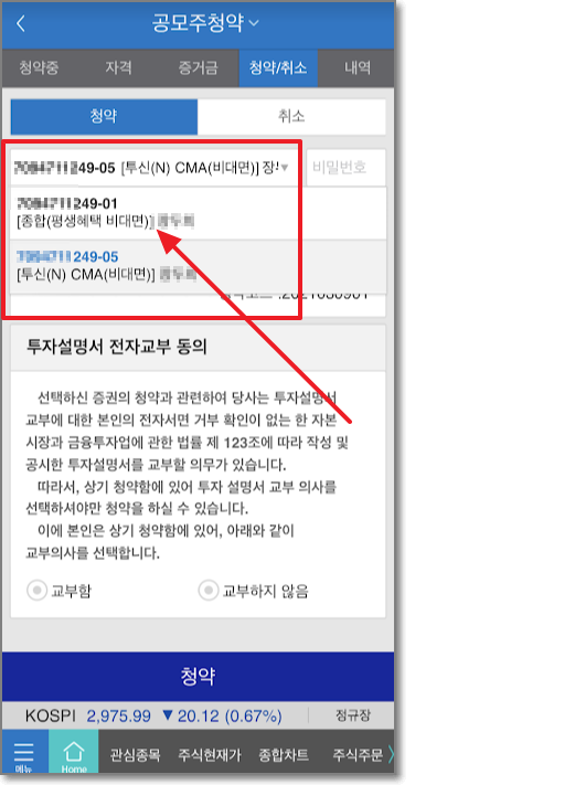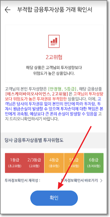 투자설명서 받음 동의에 체크하고 "확인"을 누릅니다. 그리고 나오는 2고위험이라고 나오니까 주의하시고 "확인"을 누릅니다. 사실 공모주가 첫 거래일날 떨어질 수도 있습니다. 이점 유의하셔야 합니다. 반드시 공모가보다 오르리라는 보장은 없다는 사실 꼭 주의하시기 바랍니다.