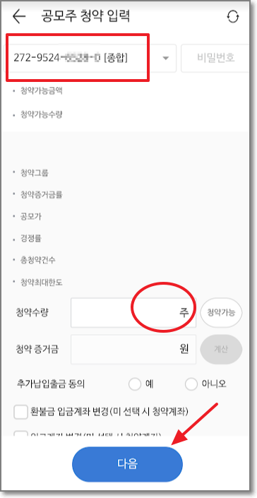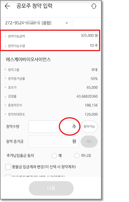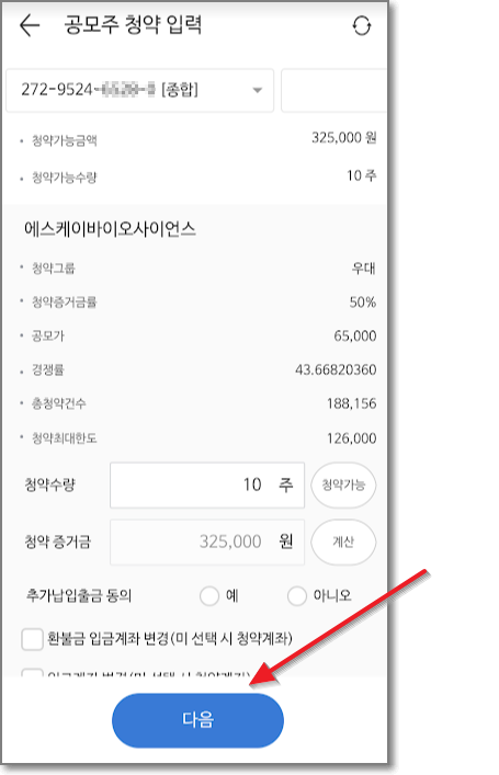 청약상세와 청약증거금을 눌러서 확인하고 난 뒤에 "청약입력"을 누르고 청약수량을 10주로 입력하고 "다음"을 누릅니다.