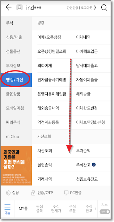 로그인이 되면 다시 "메뉴"를 누르고 왼쪽에 "뱅킹/자산"을 누른다음에 화면을 밑으로 내립니다.