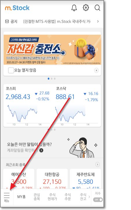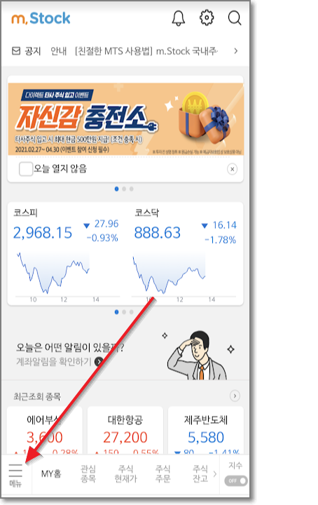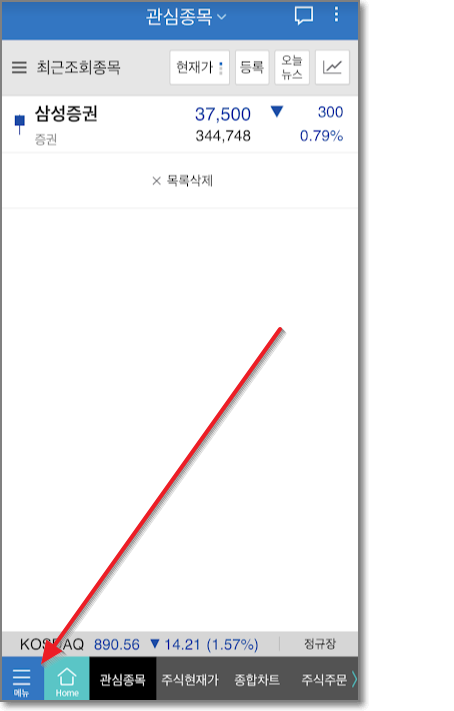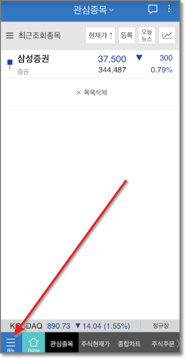 삼성증권 앱을 실행하면 에스케이바이오사이언스 공모주청약 배정방식 안내라는 팝업창이 뜹니다. "닫기"를 누르고 앱의 첫화면에서 왼쪽 밑에 "메뉴"를 누릅니다.