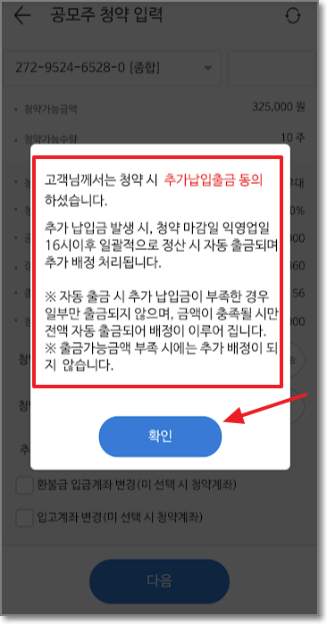 10주로 하고 청약증거금이 325000원인 것을 확인하고 "다음"을 누르면 NH투자증권에서 보았던 문구가 나옵니다. 하지만 말이죠. 미래에셋은 이번에 균등배정 물량이 63만주입니다. 혹시 21만계좌가 신청하면 3주 나올 수 있겠지만 10주의 증거금인 325000원을 넘을 수는 없겠죠. 하지만! 혹시라도 10만계좌만 신청하면 6주니까 가능성이 아예 없다고는 할 수 없겠네요.