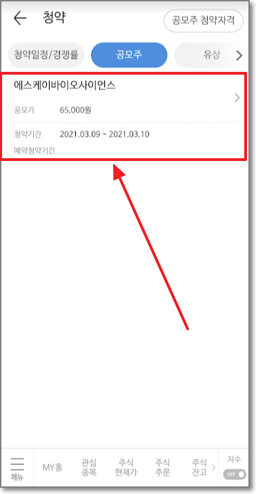 화면을 내리다보면 "권리/청약"쪽에 "공모주 청약"을 누르고 다음에 나오는 "에스케이바이오사이언스"를 직접 누릅니다.