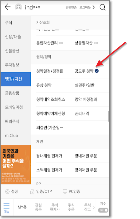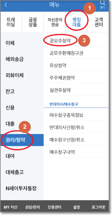 로그인을 했으면 다시 "메뉴"를 누르고 "뱅킹/대출", "권리/청약", "공모주 청약"순으로 들어갑니다.