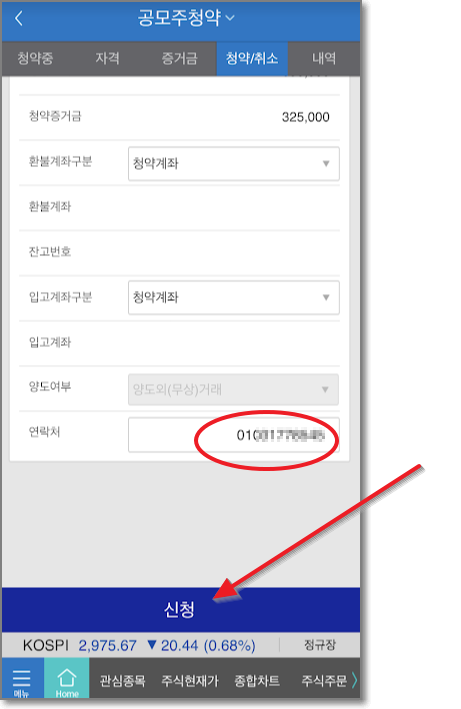 역시 이번에도 계좌에 325000원을 입금해야 합니다. (미래에셋대우는 온라인 청약수수료 무료입니다.)