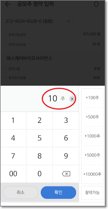 325000원이 입금된 것 확인하고 청약수량은 10주로 입력합니다.