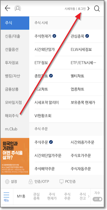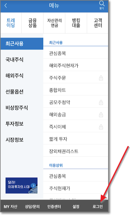미래에셋대우 앱을 열고 왼쪽 밑에 "메뉴"누르고, 오른쪽 위에 "시세자동/로그인"을 눌러서 로그인을 합니다.