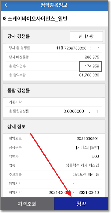 "에스케이바이오사이언스_일반"을 누르고 보면 이 글 작성시점이 3월9일 오후1시도 안되었는데 벌써 총청약건수가 174,959건입니다. 삼성증권에 배정된 균등배정물량인 143,438주를 벌써 넘습니다. 1주씩 받는 사람도 있겠지만 못받는 사람도 생길 것입니다.(물론 내부정책이 비례물량에서 가지고 온다면 1주씩은 돌아갈 듯 합니다.)