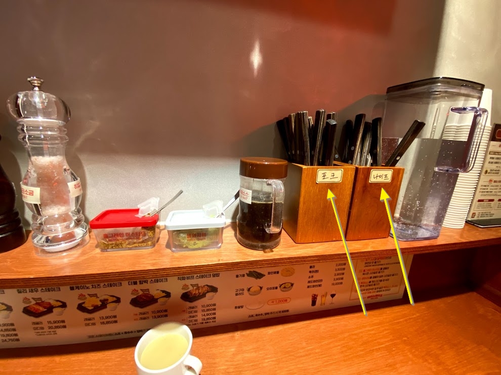 매장 내부는 왠지 일본 스타일의 식당 느낌이 드는데요. 작은 의자와 좁은 식탁 그리고 공간활용을 최대로한 양념통들과 나이프, 포크, 물 등이 그런 느낌을 들게 하더군요. 요즘 코로나때문에 투명 아크릴을 세우는 식당들도 있는데 여기는 자동으로 가운데 칸막이가 생긴셈이어서 거리두기가 코로나이전부터 의도치 않게 되고 있는 느낌입니다.