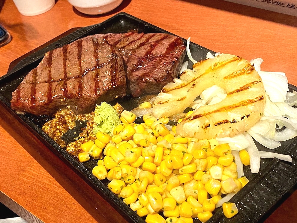 조금 더 기다리니까 잘 구워진 스테이크가 등장했습니다. 아래 보이는 사진은 "레귤러(1덩이)"에 "파인애플"을 추가한 모습입니다. 스테이크 구워진 모습이 아주 그 자태가 곱습니다.
