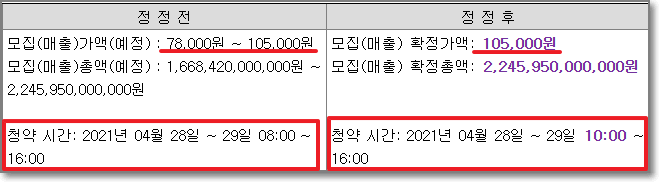 SKIET(에스케이아이이테크놀로지)의 공모가(公募價)가 공모가 희망밴드(범위)의 최상단인 10만 5천 원으로 확정되었습니다. SKIET 공모주 청약을 혹시라도 처음 들으신 분은 SKIET의 공모주 청약에 대한 정리한 내용 참고해주시고요. SKIET가 며칠전 4월 22일(목)~4월 23일(금) 양 이틀간 기관 투자자를 대상으로 실시했던 수요예측 결과를 4월26일(월) DART(전자공시시스템)에 공시했는데요. 공모가는 78,000에서 105,000원의 범위에서 최고가인 105,000원으로 결정되었으며 시간이 조금 변경되었다는 점도 눈에 띕니다. 원래는 청약시간이 28일(수),29일(목) 이틀간 08시부터 16시였는데 시작시간이 2시간 늦춰진 "10시부터"로 바뀌었습니다.