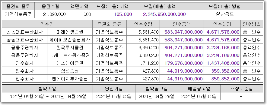 공시를 보다보면 우리가 알고 있던 5개의 증권회사(미래에셋증권, 한국투자증권, 에스케이증권, 삼성증권, 엔에이치투자증권) 이외에 제이피모간 증권회사와 크레디트스위스 증권이라는 외국회사까지 참여한 것을 알 수 있습니다.(SKIET가 만드는 것이 배터리 분리막인데 이 제품의 미래성장성이 뛰어난 것으로 보고 있는 것 같습니다.) 주의할 점은 납입기일을 보면 5월 3일이지만 10만 5천 원의 청약증거금인 52만 5천 원은 4월 28일과 4월 29일 이틀 안에 각 증권사 종합계좌에 납입하고 공모주 청약을 신청해야 합니다.