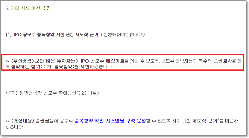 현재는 한 명당 공모주 배정에 참여한 모든 증권사에서 중복으로 청약을 신청할 수 있습니다. 하지만 이 중복청약은 SKIET가 마지막이 될 것으로 예상되는데요. 금융당국이 자본시장법 시행령 개정안을 통해 중복청약을 금지시키면서 금년(2021년) 6월 19일 이후에 증권신고서를 내는 기업은 청약수량과 관계없이 제일 먼저 접수한 청약만 인정받을 수 있기 때문에 사실상 중복청약이 불가능한 게 됩니다.