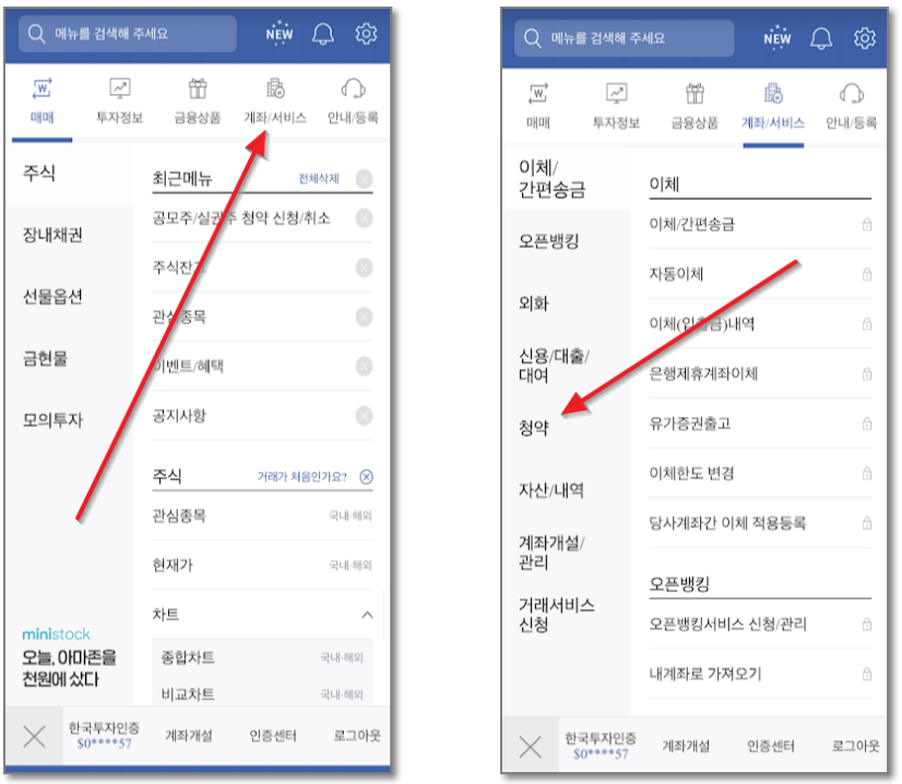 한국투자증권은 온라인으로 해도 수수료가 2000원입니다. 그러니까 525000원에 수수료까지 해서 527000원을 입금해야 합니다.(그냥 53만 원 입금하시면 편합니다.) 한국투자증권 앱을 열고 (자동 로그인됩니다.) "계좌/서비스"를 누르고 왼쪽 리스트에서 "청약"을 누릅니다.
