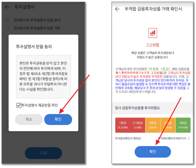 "투자설명서 받음 동의"에서 "투자설명서 제공 받음 확인" 앞에 체크하고 "확인"을 누릅니다. 그리고 나오는 2 고위험이라고 나오니까 주의하시고 "확인"을 누릅니다. 사실 공모주가 첫 거래일날 떨어질 수도 있습니다.(그런 적은 없지만요) 이점 유의하셔야 합니다. 반드시 공모가보다 오르리라는 보장은 없다는 사실 꼭 주의하시기 바랍니다.(하지만 액체 배터리의 배터리 분리막을 만드는 SKIET의 성장 가능성은 사실 엄청나지요)