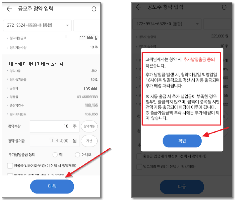 10주로 하고 청약증거금이 525,000원인 것을 확인하고 "다음"을 누르면 오른쪽과 같은 문구가 나옵니다. 균등배정으로 인해서 청약건수가 엄청나게 폭증한 상태에서 증거금을 넘는 금액의 배정물량이 나올 수는 없으므로 걱정 마시고 "확인"을 누릅니다.
