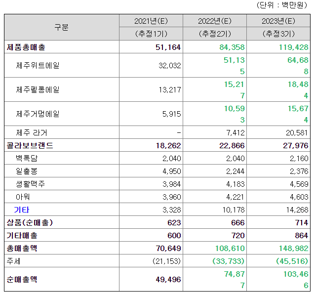 제주맥주 매출액 세부내역
