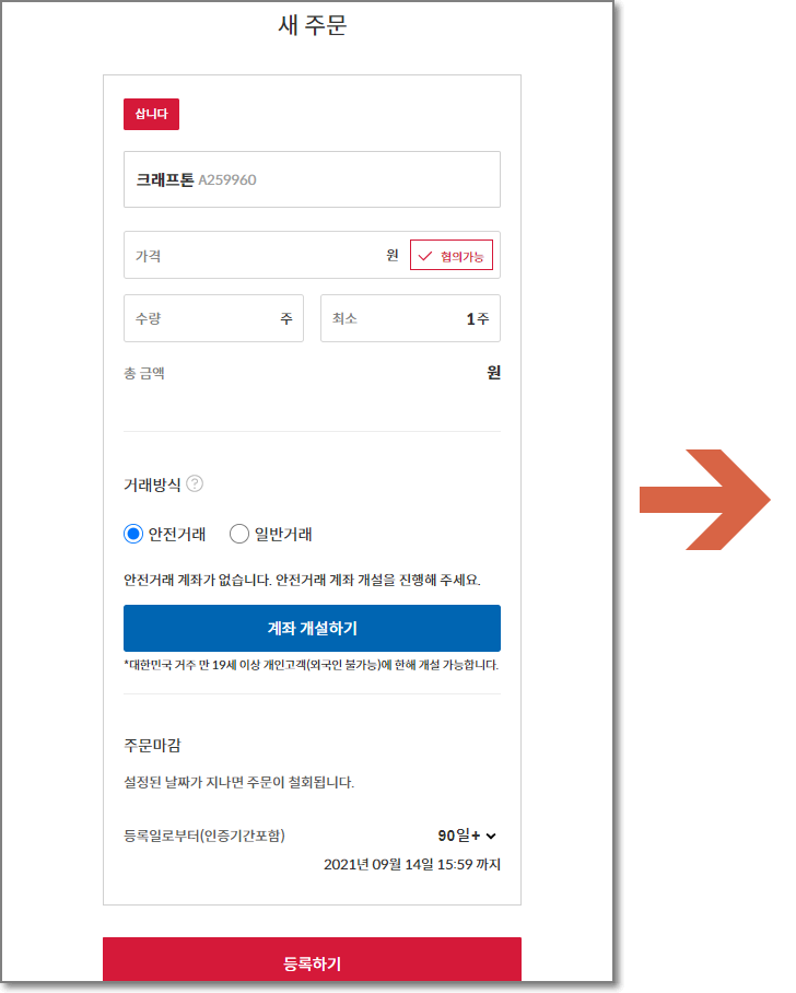 "새 주문"이라는 창이 나오면 원하는 가격과 수량을 입력하고 안전거래가 처음이므로 "계좌 개설하기"를 누릅니다.
