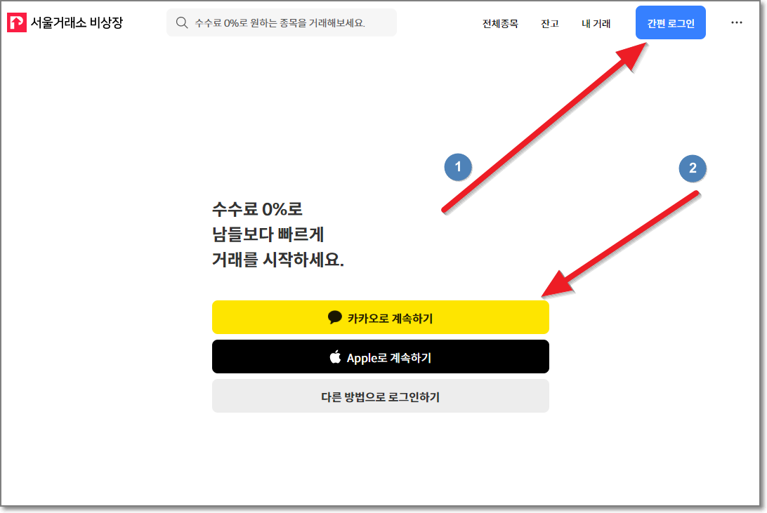회원가입은 "카카오로 계속하기"로 쉽게 할 수 있으며 본인인증까지 거쳐야 매매를 할 수 있습니다.