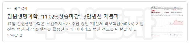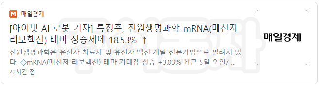 특징주, 진원생명과학-mRNA(메신저 리보핵산) 테마 상승세에 18.53% 급등