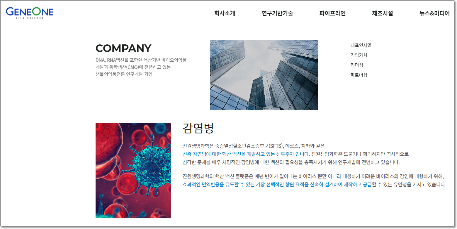 최근에 주가가 오르는 배경에는 "메신저 리보핵산(mRNA)기반 신속 백신 제작 플랫몸을 활용한 지카 바이러스 백신선도물질 발굴 및 유효성 평가"라는 국책과제의 주관기관으로 선정된 이유가 큰데요. 이 연구로 1년7개월간 7억9200만원의 연구비를 지원한다고 했으며 이 때 전문가들은 진원생명과학이 보유하고 있는 코로나19백신 생산기술의 가치가 4조원에 이를 것이라고 전망한 바 있습니다.