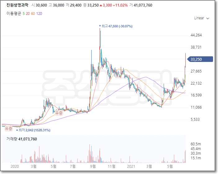 진원생명과학의 최고가는 지난해 9월22일 47,550원이었으며 최저가는 지난해 1월8일에 2042원이었습니다.