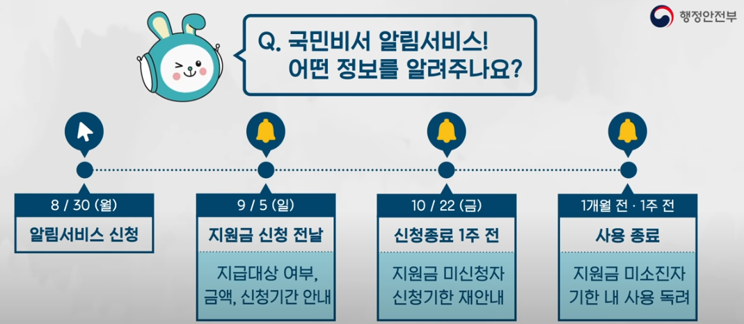 국민 비서 알림서비스를 신청하면 개개인의 날짜에 맞춰서 지원금 신청 전날 지급대상여부, 금액, 신청기간을 안내해드리며 10월22일(금)요일이 되면 신청종료가 1주남았다고 지원금 미신청자들에게 신청기한을 재안내하는 알림을 보내며, 사용종료 1개월전과 1주전 각 1번씩 총 두번 지원금 미소진자(다 못쓴분들)들 에게 기한 내 사용을 독려하는 알림이 가게 됩니다.