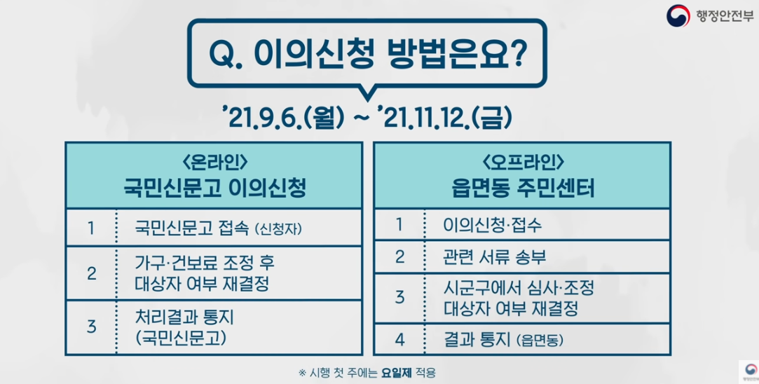 소득이 지난해에 비해서 줄었거나 대상자가 왜 안되었는지 궁금한 경우 이의신청을 할 수 있습니다. 온라인으로는 국민신문고에서 가능하며 오프라인은 읍면동 주민센터에서 이의신청이 가능합니다. 이 역시 첫 주에는 요일제 5부제를 실시합니다.