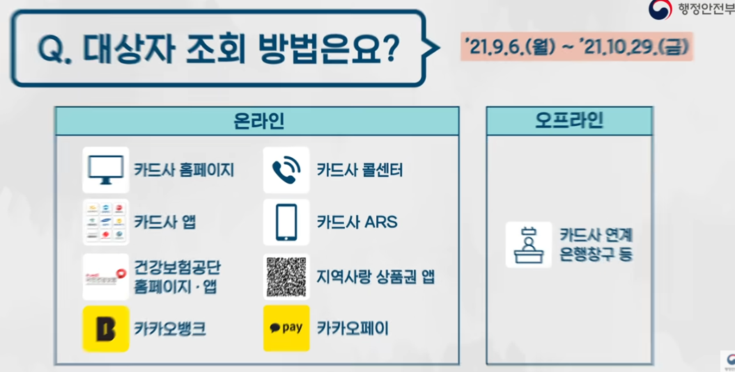 자신이 5차 재난지원금 대상자인지 조회하려면 카드사 홈페이지, 카드사 앱, 건강보험공단 홈페이지와 앱, 카카오 뱅크, 카카오페이, 지역사랑 상품권 앱(ㅇㅇ페이), 카드사 ARS, 그리고 카드사에 직접 전화해도 조회가 가능하며 오프라인으로는 카드사가 연계된 은행 창구에서 조회가 가능합니다.