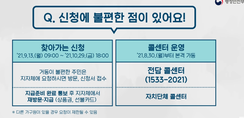 5차 재난지원금 신청에 불편한 점이 있다면 찾아가는 서비스를 신청할 수 있는데요. 거동이 불편한 주민은 지자체에 요청하시면 지자체에서 방문하여 신청서를 접수해 가고 다음날 다시 지자체에서 방문하여 지급까지 해드립니다.