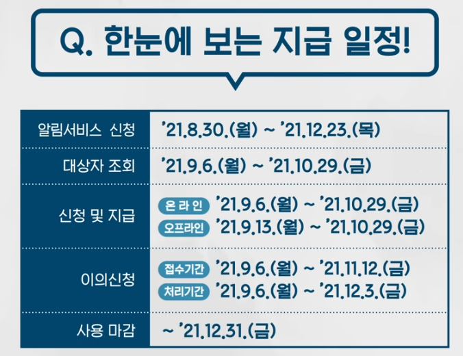 위에서 신청하는 알림 서비스는 8월 30일부터 12월 23일까지 지속되며, 대상자 조회는 9월 6일부터 10월29일까지 지속됩니다. 또한 신청은 온라인과 오프라인을 나눠서 신청하게 되는데요. 9월6일부터 10월 29일까지는 온라인으로 신청가능하며 9월13일부터 10월29일까지는 오프라인으로 신청이 가능합니다. 그리고 자격에 이의가 있는 분들은 6일부터 11월 12일까지 이의신청을 하는 기간이 주어집니다. 마지막으로 사용 마감은 12월 31일로 이때까지 사용하지 않으면 소멸되게 됩니다.