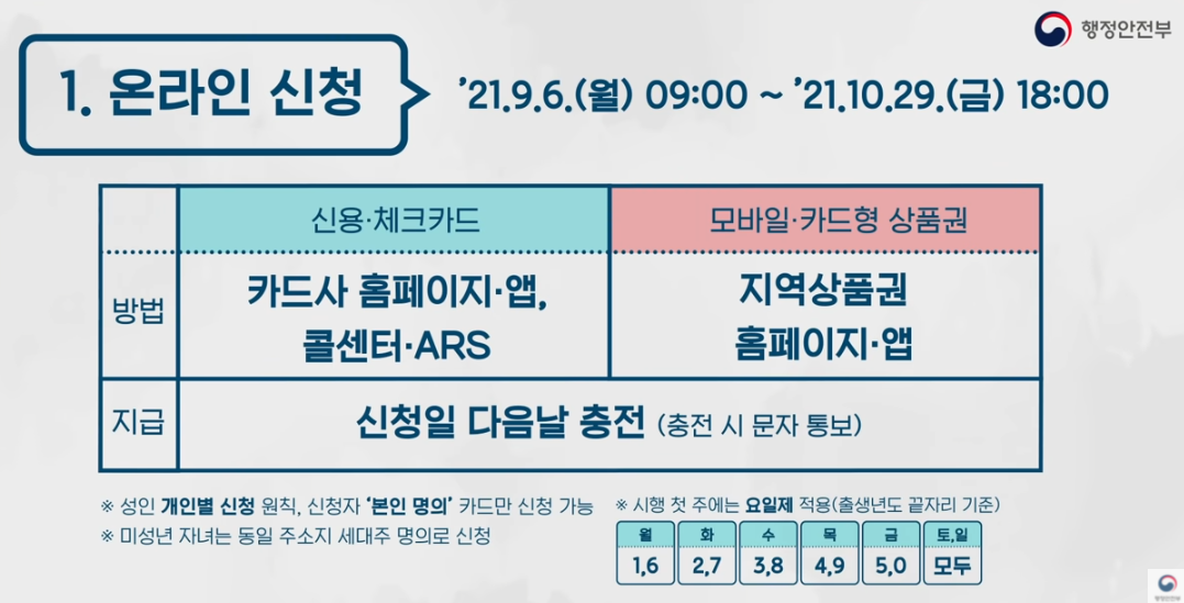 온라인 신청은 신용. 체크카드는 카드사 홈페이지와 앱 그리고 콜센터나 ARS로 신청이 가능하며 모바일. 카드형 상품권이 있는 ㅇㅇ페이 등과 같은 경우는 지역상품권 홈페이지나 앱에서 신청이 가능하고, 신청을 하면 다음날 바로 문자와 함께 충전이 됩니다. 미성년 자녀의 경우에는 동일 주소지의 세대주 명의로 신청이 가능합니다.