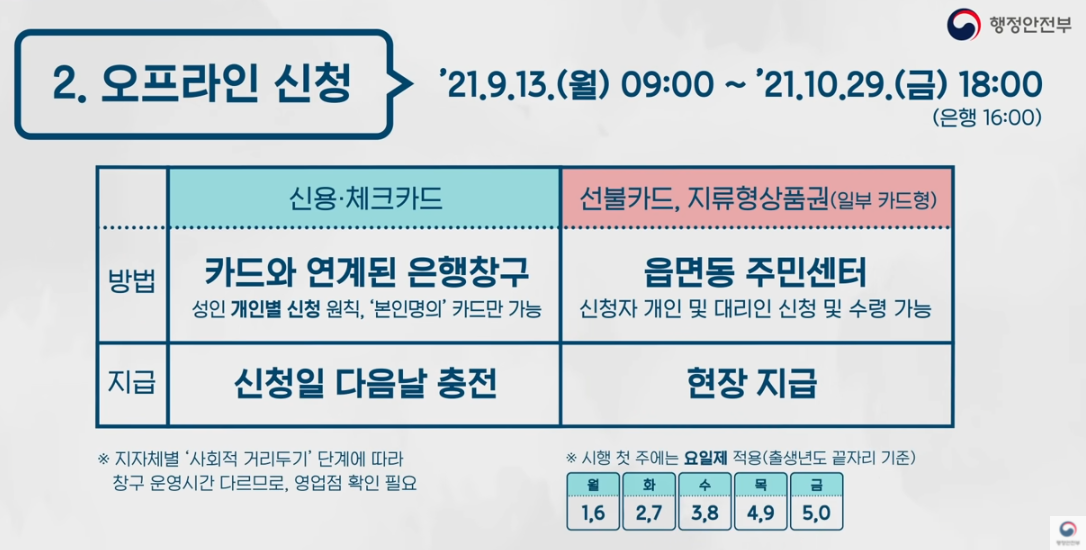 오프라인 신청은 9월 13일부터 시작되며 신용카드나 체크카드는 카드와 연계된 은행 창구에서 성인 개인별 신청을 원칙으로 진행되며 반드시 본인 명의의 카드만 가능합니다. 선불카드나 ㅇㅇ페이 등의 경우에는 읍면동 주민센터에서 신청자 개인이나 대리인 신청이 가능하며 수령도 대리인이 가능합니다. 모두 신청일 다음날 충전되고 지급됩니다. 주민센터의 경우 다음날 다시 한번 방문해야 합니다.