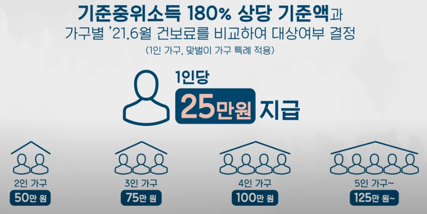 이번 재난지원금은 기준 중위소득을 180%로 정해서 지급하는데 이를 기준 삼기 위하여 21년도 6월 건보료를 기준으로 하여서 소득 하위 80%에 해당하는 사람들과 1인 가구, 맞벌이 가구 중 특례를 적용하여 총 88%의 국민들이 각 25만 원씩 받을 수 있도록 하였습니다. 지난해와 조금 다른점은 성인이라면 각각 25만원씩 신청한다는 점과 4인가구 100만원에서 끝나는게 아니고 5인 6인가구도 1인당 25만원씩 지급한다는 것입니다.
