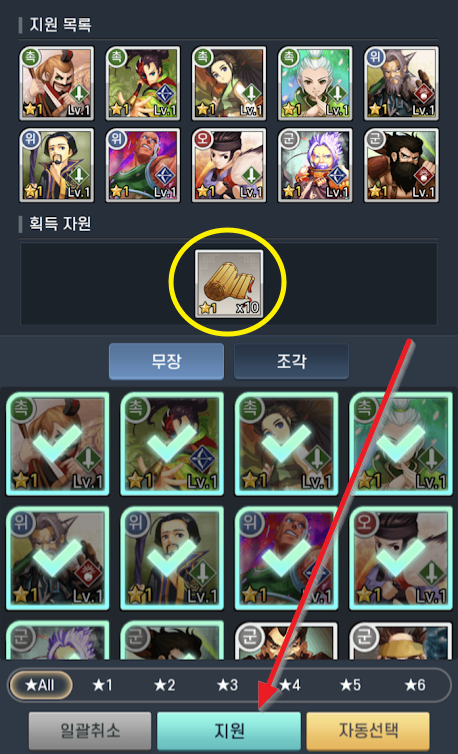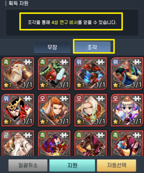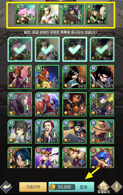 마지막으로 3성 무장 4명은 5만 골드를 사용하여 4성 무장으로 합성됩니다.