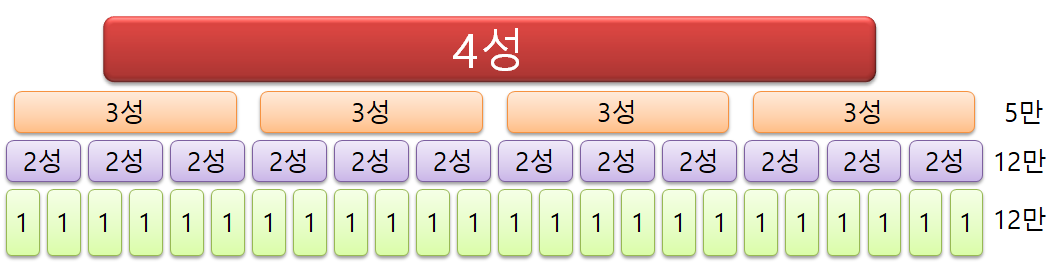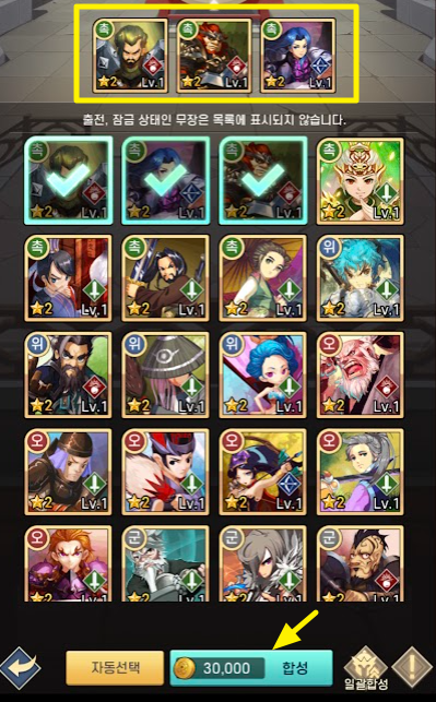 2성 무장 3명은 3만 골드를 사용하여 3성 무장으로 합성됩니다.