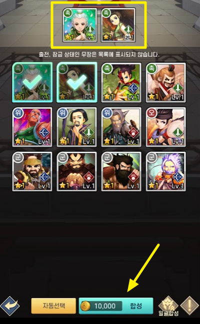 1성 무장 2명은 1만 골드를 사용해서 2성으로 합성되며