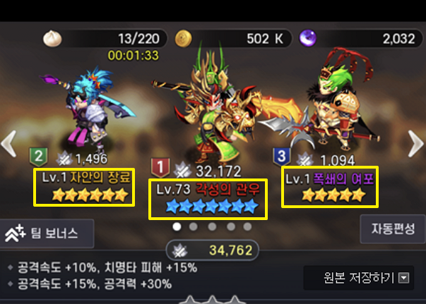 초반에는 관우, 여포, 장료 조합으로 공격속도 +10%, 치명타 피해 +15%, 공격속도 +15%, 공격력 +30%의 효과를 가지고 조비를 얻을 때까지 진행하시면 됩니다.