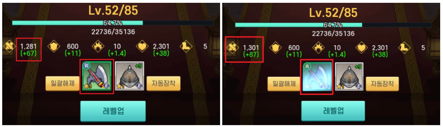 빨간 박스를 잘 보시면 공격력에서 차이가 있음을 알 수 있습니다. 실제로 +67보다 30% 추가된 +87로 공격력이 올라간 것을 확인할 수 있습니다.