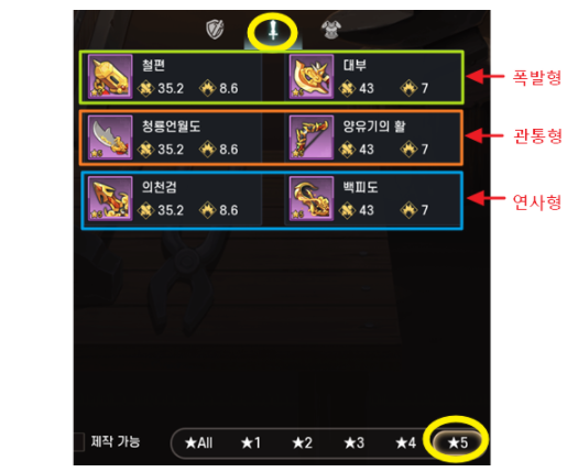 주성 > 내정 > 대장간에 가보셨다면 아시겠지만 가운데 칼 모양(무기)을 누르고 아래쪽 5성을 눌러보면 6개의 무기가 나옵니다. 철편, 청룡언월도, 의천검, 대부, 양유기의 활, 백피도 이렇게 나오는데요. 위부터 폭발형, 관통형, 연사형 순으로 각각 2개씩 있습니다. 그럼 여기서 왜 같은 타입 무기가 두 개나 있을까 라고 생각할 수 있는데요. 왼쪽 무기는 치명타 우선 무기이고 오른쪽 무기는 공격력 우선 무기입니다.