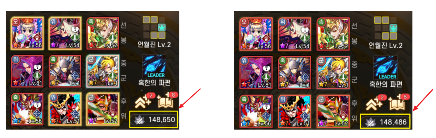 위의 사진은 모든 구성원이 동일하고 오직 유비의 무기를 "촉"이라고 쓰인 무기에서 "위"라고 쓰여진 무기로 바꾸었을 뿐인데 총수치의 변화가 있음을 알 수 있습니다. 즉 대전모드에서도 국가 보너스는 적용됩니다.