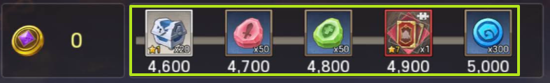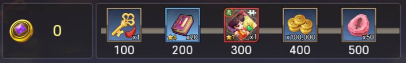최소 점수인 100점만 넘기 시작해도 고급 소환에 쓰이는 황금열쇠, 경험의 고서 등을 받을 수 있지만 가장 마음에 드는 것은 "천기의 월영" 조각을 300점에서 1개, 600점에서 2개, 1000점에서 3개, 1500점에서 4개, 2000점에서 3개, 2500점에서 3개까지 해서 16개의 "천기의 월영"조각을 받을 수 있어서 조각 10개로 "천기의 월영"을 소환하고 나머지로는 4성 연구비 서로 만들거나 공용 조각과 함께 사용해서 천기의 월영을 승급할 때 사용할 수 있습니다.
