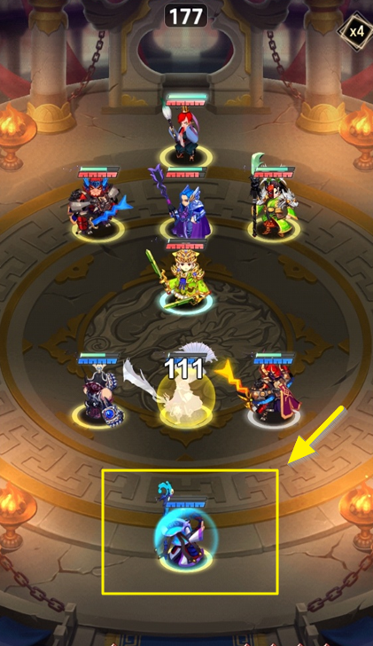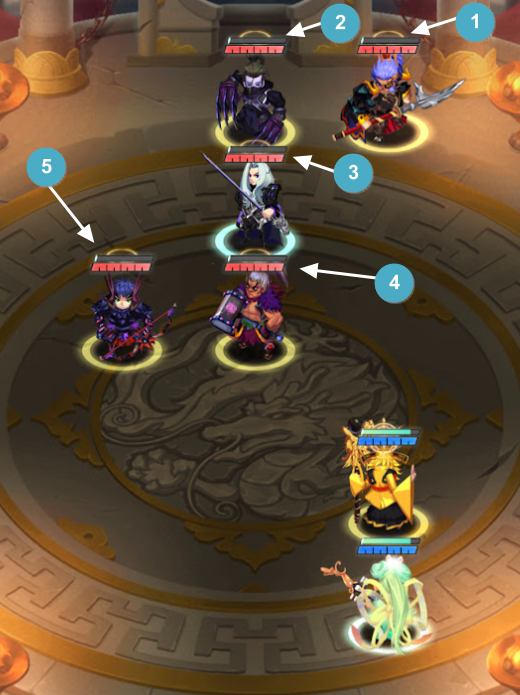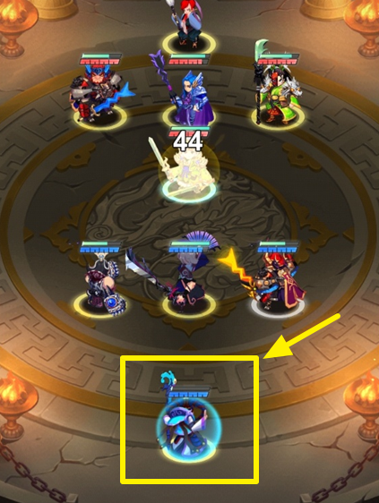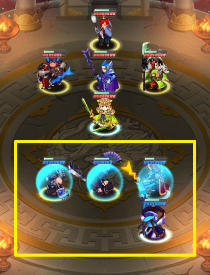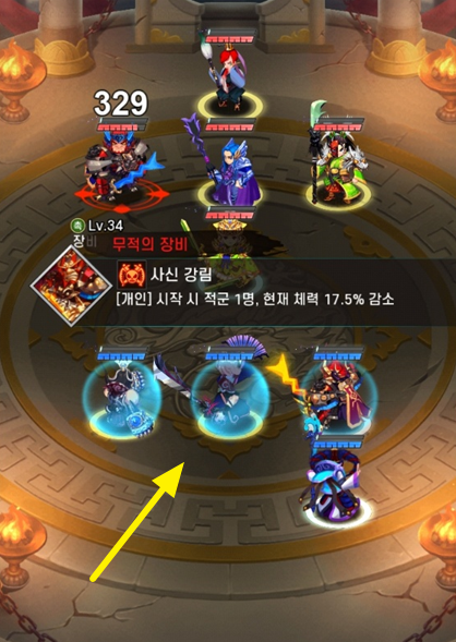 대전을 시작하자마자 채모에게 보호막이 생성된 것을 볼 수 있는데요. 앞줄에 사마의에게 있는 노란색은 보호막이 아닙니다. 보호막은 하늘색이 도는 원입니다.