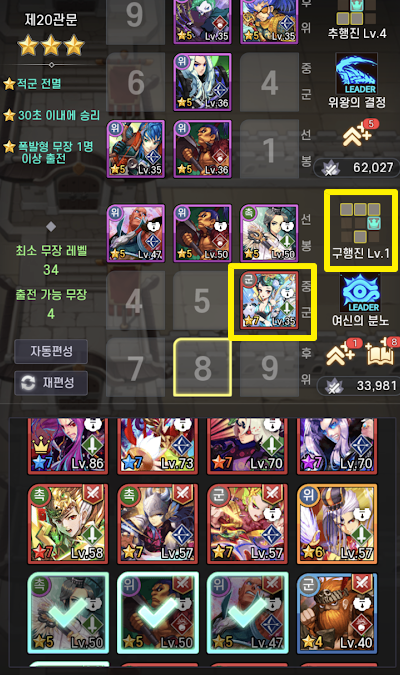 실험 장소는 역시 관문돌파이며 제 20관문입니다. 진형은 구행진이며 구행진의 리더 자리에 초선을 위치시켰습니다.