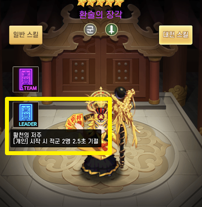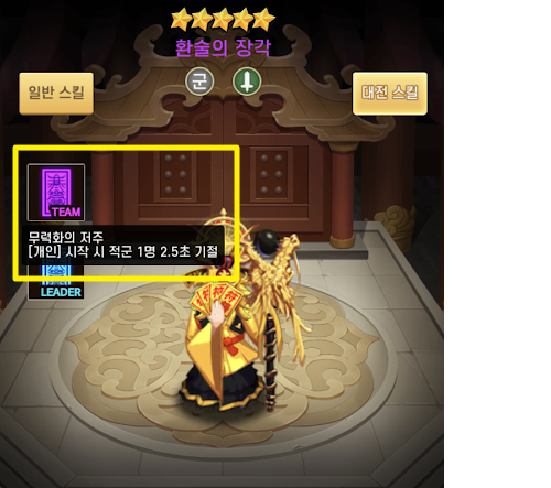"군웅 5성 무장 환술의 장각"의 대전스킬중에 팀스킬은 "[개인] 시작 시 적군 1명 2.5초 기절"이며 리더스킬은 "[개인] 시작 시 적군 2명 2.5초 기절"입니다.