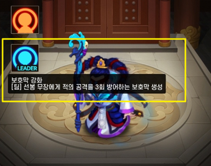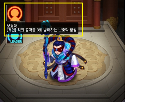 위나라 4성 무장인 채모는 일반스킬로는 "[개인] 적의 공격을 3회 방어하는 보호막 생성"이 있으며 리더스킬로는 "[팀] 선봉 무장에게 적의 공격을 3회 방어하는 보호막 생성"이 있습니다. 우선 리더가 아닌 상태에서의 채모에게 방어막이 생성되는지 확인해보겠습니다.