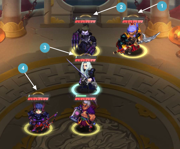 다음 화면에서도 역시 선봉 무장 3명에게만 보호막이 생성되어있으며 채모는 보호막이 없는 것을 알 수 있습니다. 따라서 대전모드에서 "개인스킬"과 "리더 스킬"을 중복 적용이 되지 않는다는 것을 알 수 있습니다.