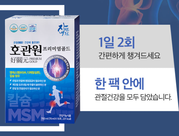 호관원 프리미엄 골드 선보여 호관원 프리미엄으로 많은 사랑을 받고 있는 호관원이 한층 업그레이드된 ‘호관원 프리미엄 골드’를 선보였는데요. 호관원 프리미엄 골드에는 기존의 호관원과는 달리 체내 흡수율이 좋아 인체 내 관절 강화용 등으로 많이 사용되고 있는 칼슘이 첨가됐습니다.
