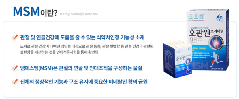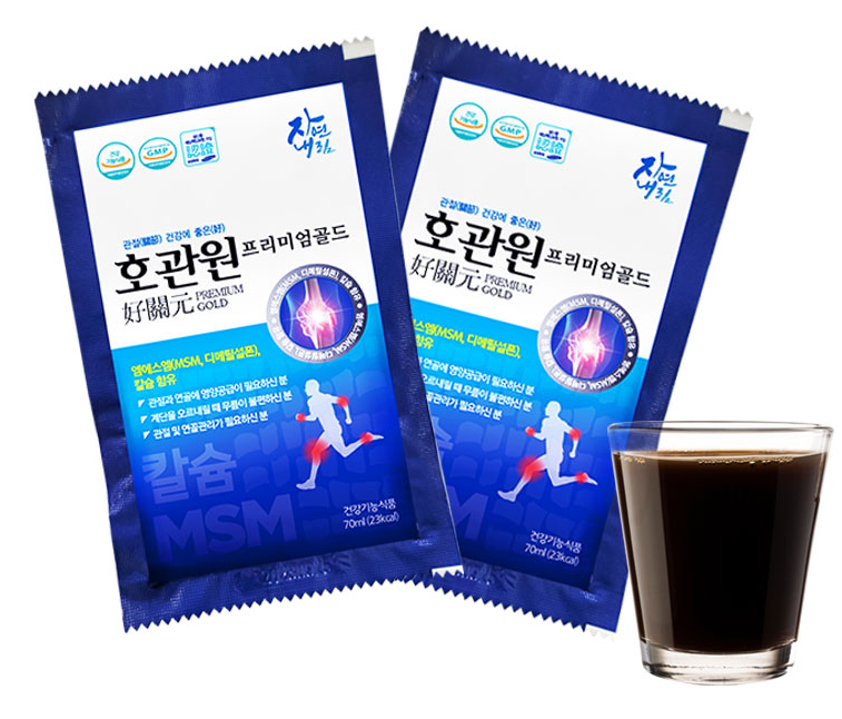 호관원 프리미엄 제품의 메인 성분인 MSM은 인체 적용시험을 통해서 관절의 불편함을 개선하는데에 도움을 줄 수 있다고 확인된 성분이며 특히 뼈와 뼈를 잡아주는 인대와 관절을 형성해주는 성분인 MSM은 관절 부상과 노화등으로 인해 관절건강이 안 좋아진 사람들에게 관절 통증을 줄여주고 관절을 움직일 때 드는 이물감을 줄이는데 효과가 큰 것으로 잘 알려져 있습니다.각종 염증 완화와 염증을 일으키는 성분으로 알려진 사이토카인의 인체 내 활동 억제에도 도움을 줄 수 있다고 알려져 있습니다. 또한 항산화 작용을 돕는 성분인 글루타티온 생성에도 관여한다고 알려져 있습니다. 또한, 호관원 프리미엄은 알약이 아닌 쉽게 마실 수 있는 액상 형태로 되어 있어 인체에 빠른 흡수율을 돕고 알약 섭취가 힘든 어르신들도 간편하게 섭취할 수 있다는 장점이 있습니다.